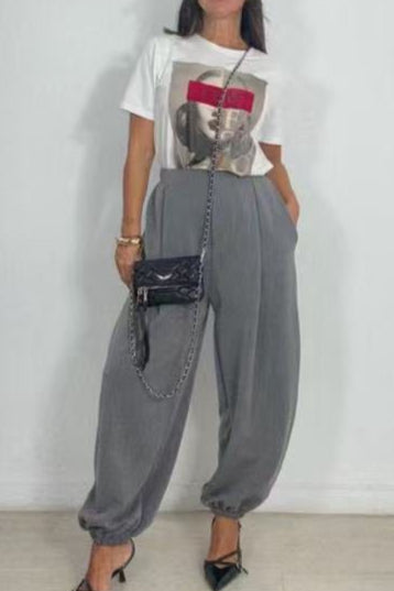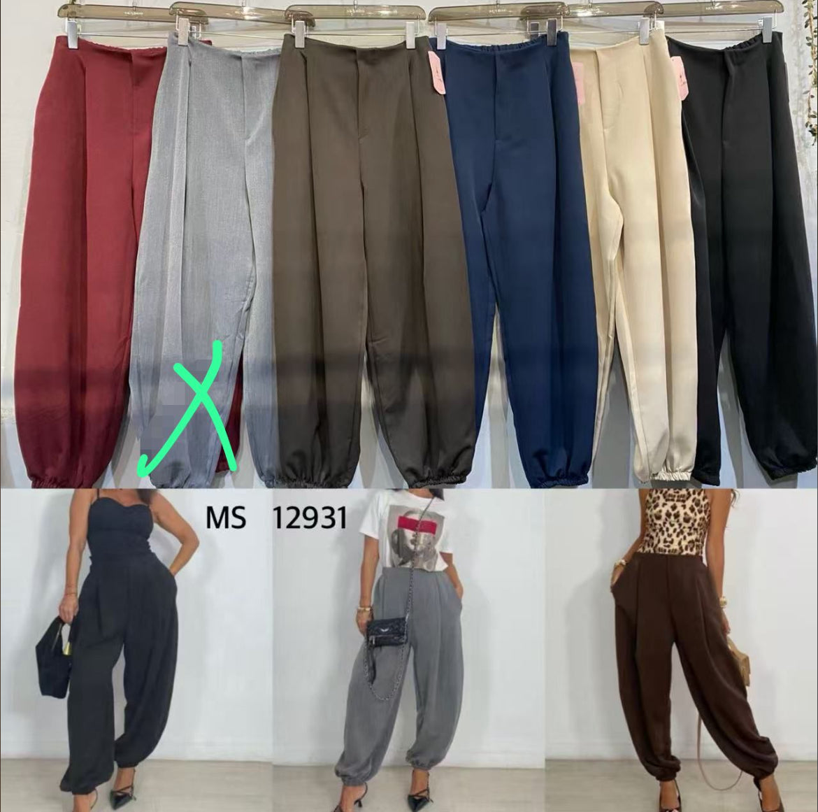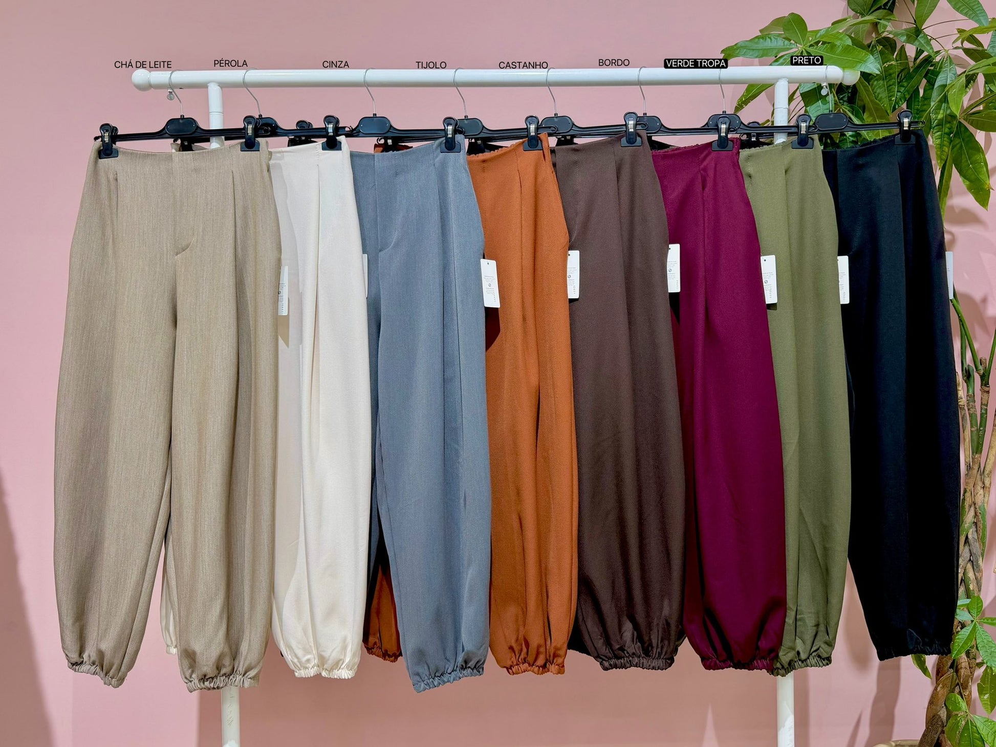 Calça em tecido poliester inverno, perna justa com elástico, tem bolsos