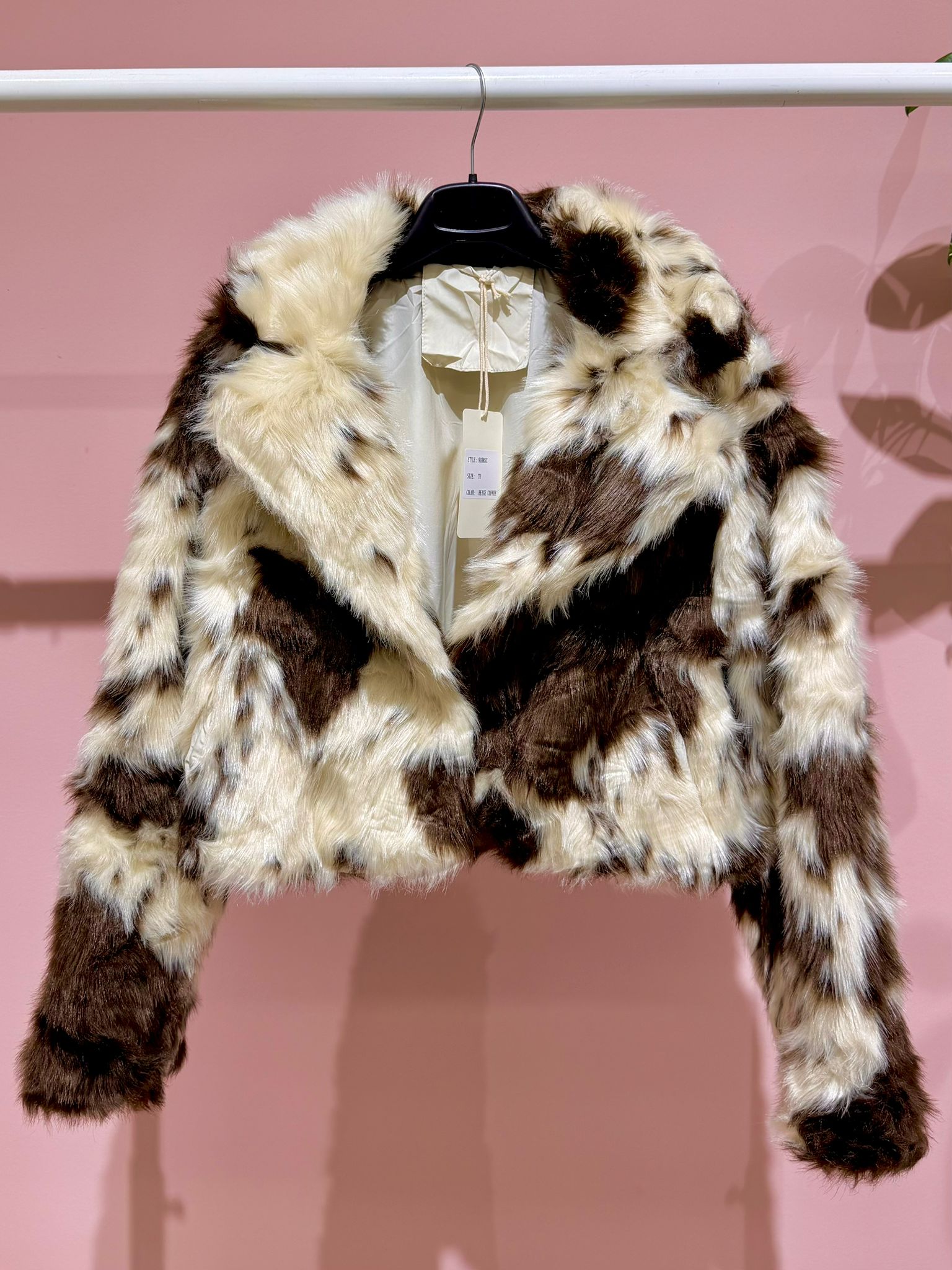 ℹ️: Casaco pelo, estampado vaca, tem bolsos